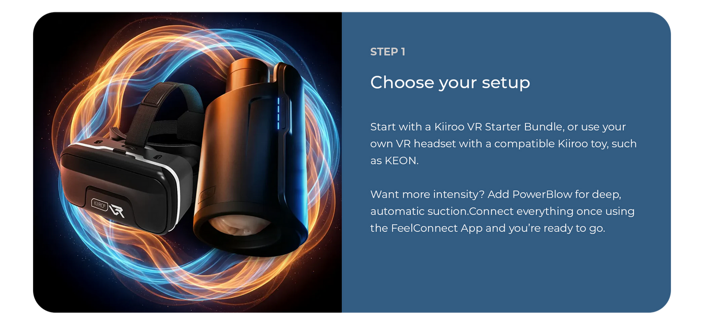 Use your own VR headset and connect your Kiiroo toy through the FeelConnect App, or start with a Kiiroo VR starter kit that includes everything you need to get set up right away.